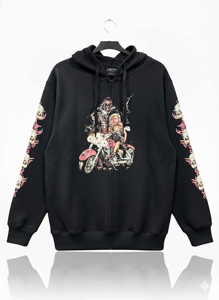 Matching skull-and-flame graphics down both sleeves for full 360° style.